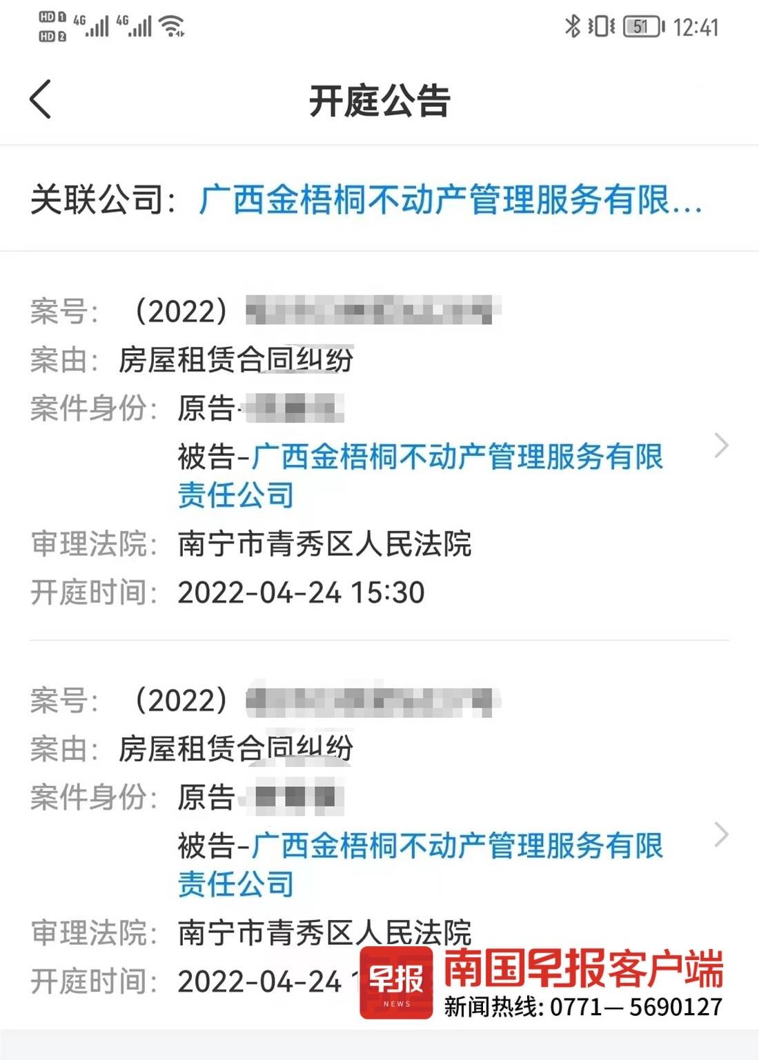 天眼查显示金梧有两条房屋租赁合同纠纷的开庭公告。业主供图