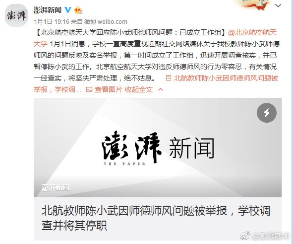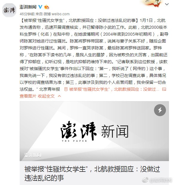 【“实名举报北航博导性骚扰”女博士:加上我已有7名女性受害】2018年第一天,美国硅谷华裔女学者罗茜茜在网上实名举报北京航空航天大学博士生导师、长江学者陈小武。其称,12年前在北航读博期间,曾被自己的副导师陈小武性骚扰。“最终决定说出这个秘密,是偶然间在网上看到,我的学妹们依旧在被他性骚扰。”她成立了一个微信群,把有着同样遭遇的北航毕业女生聚在一起,“根据证词,还有手上其他证据,间接证明被骚扰的女性,加上我一共已经有7位了。”罗茜茜告诉记者,她们当中,有的被要求在聚会上和陈小武喝交杯酒;有的被陈小武要求“做我的女朋友”;还有的也曾听到陈小武“与妻子感情不好”的抱怨……罗茜茜表示:“疑似他曾导致手下女学生怀孕,并企图用钱来封口。”1日,北航在官方微博上发表声明,称已第一时间成立了工作组,迅速开展调查核实,并已暂停陈小武的工作。红星新闻