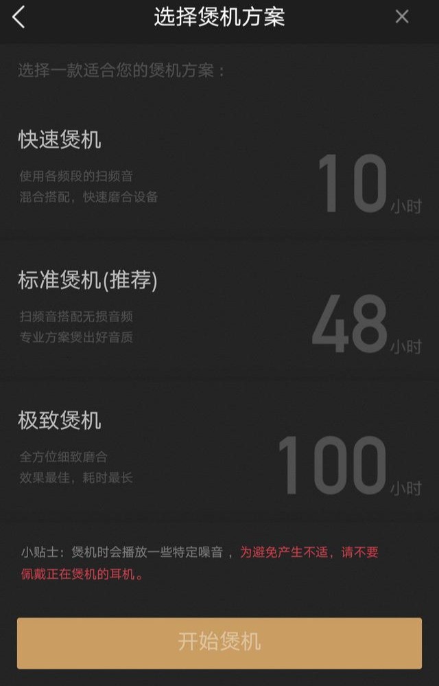 这一步是选择煲机方案,一看时间差点跪了,至少要十个小时,但为了耳机效果,我还是选择了极致煲机100小时,这里不用担心蓝牙耳机没电的情况,因为这个不需要一直进行,可以保留进程下一次再接着煲。