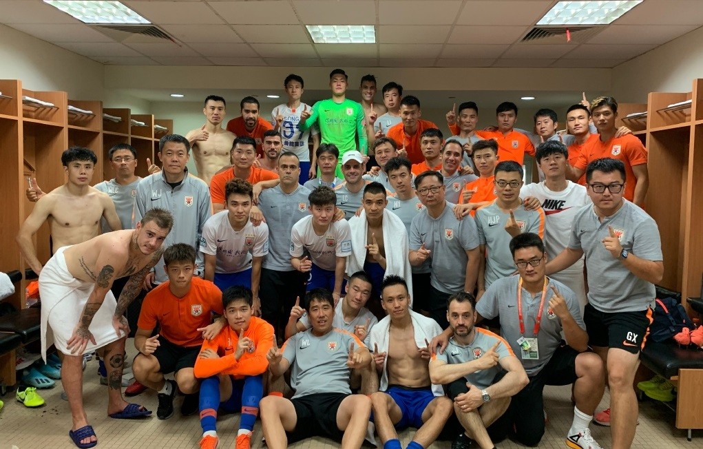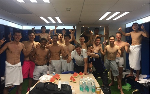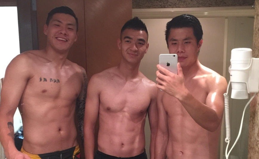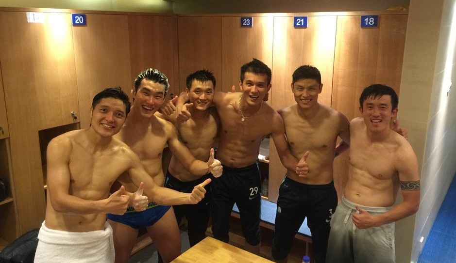 这是鲁能更衣室的合影,四个光着膀子球员的从左到右依次是蒿俊闵、外援格德斯、郑铮和张弛,他们是不是比外援还要有线条。