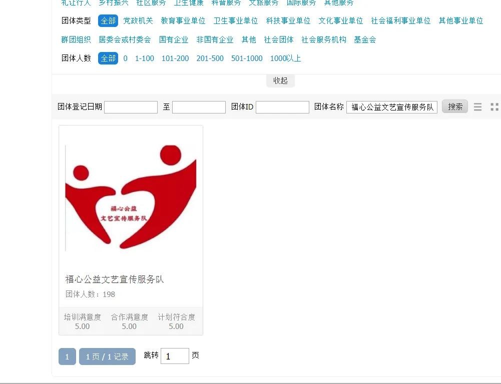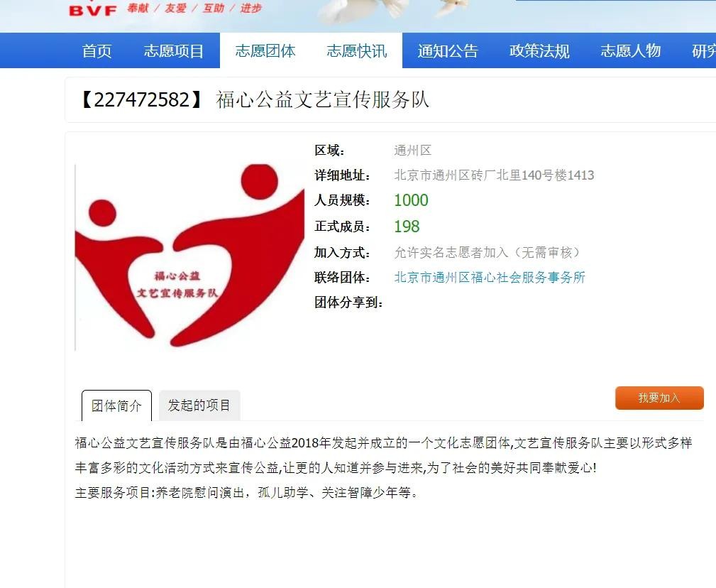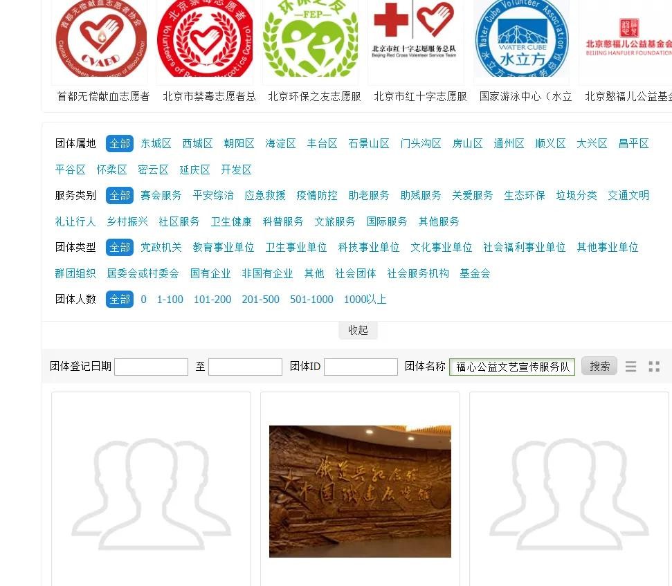 第一步:在志愿北京官网页面点击【志愿团体】,在搜索栏搜索团体ID【227472582】或搜索志愿团体全称【福心公益文艺宣传服务队】即可找到。