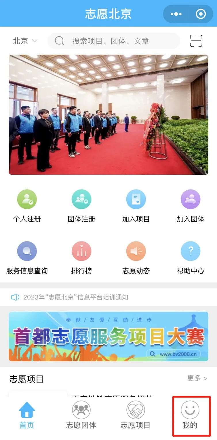 微信登陆志愿北京小程序可以查看自己参加的团体与每次公益活动记录的工时。