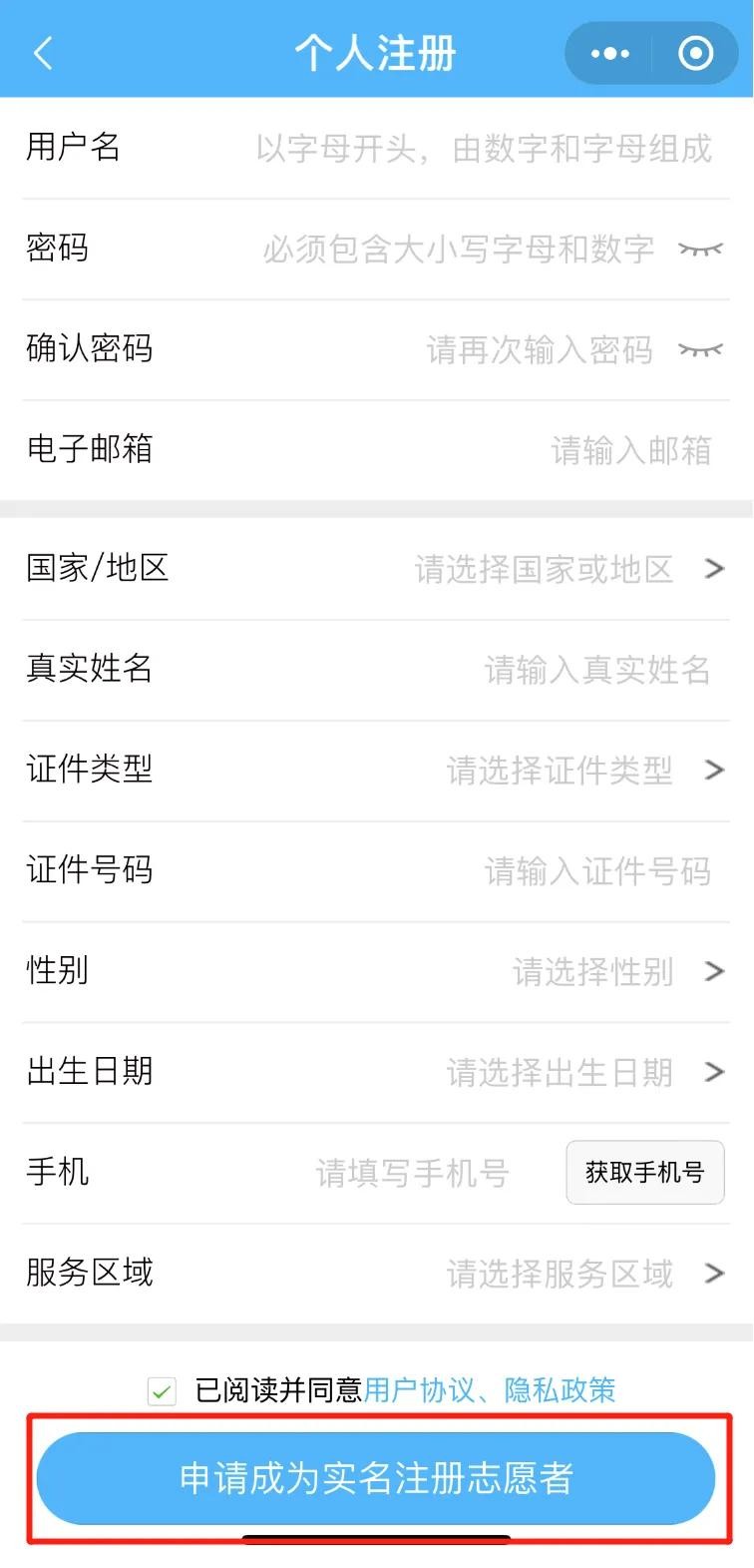 第四步:完善个人信息,点击【申请成为实名注册志愿者】,即可完成注册。