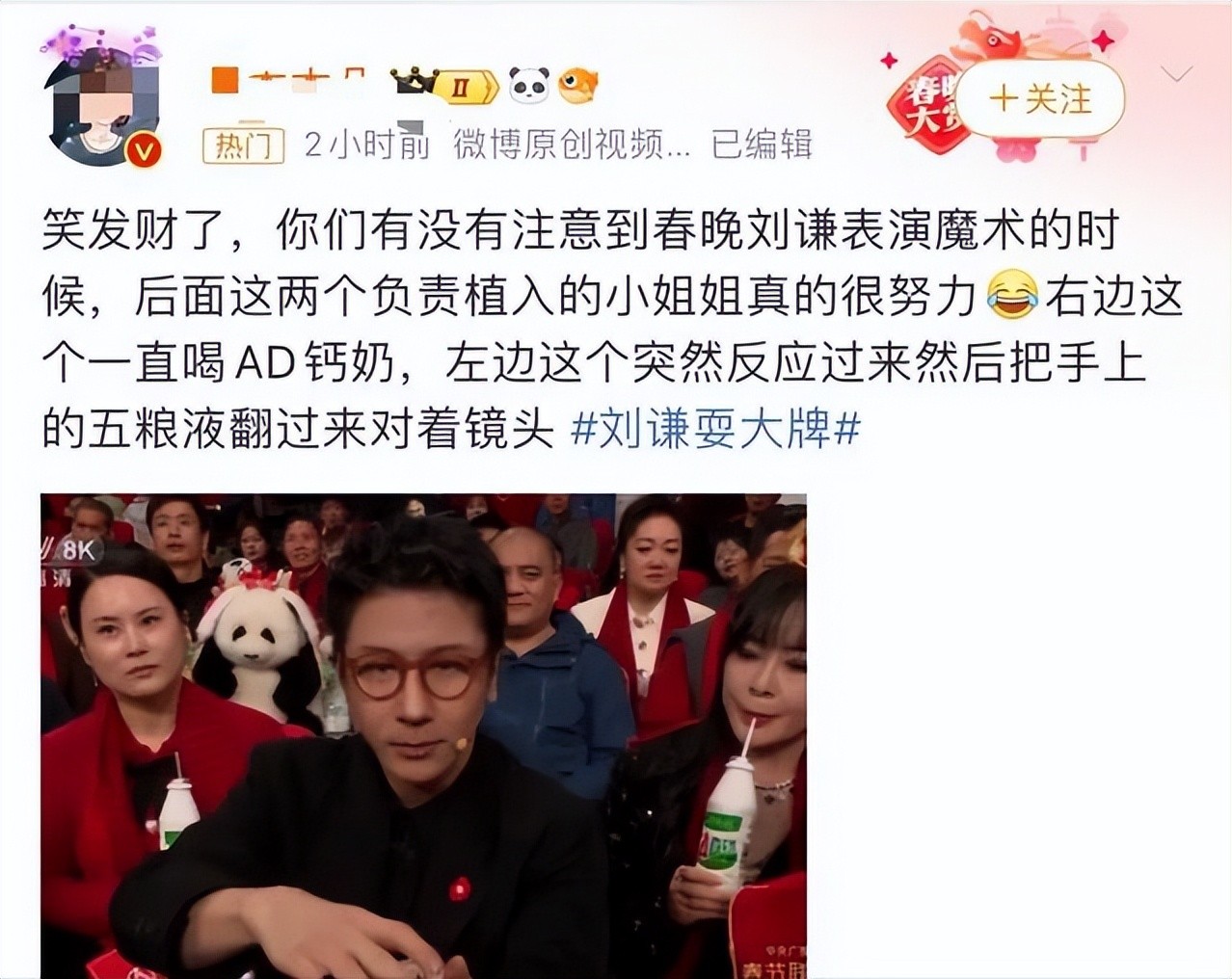 尤其让人跌破眼镜的是娃哈哈AD钙奶:当时刘谦正在秀他的魔术绝活儿,一位长得不错的大姐,直接对着娃哈哈AD钙奶“唑唑唑”地狂吸,瓶子举得老高,镜头一扫,画面简直了!愣是让娃哈哈赚足了观众的眼球,奶味十足!
