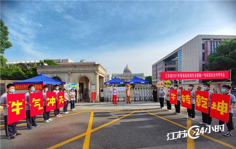 6月7日,某中学的学生早早来到南京市雨花台中学考点,手举“牛气冲天 年转乾坤”标语,为参加高考的学长加油助威。