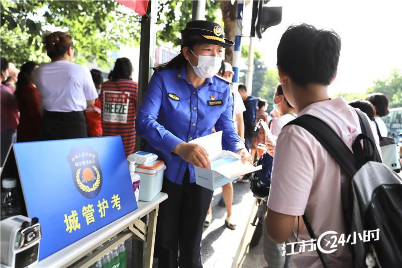6月7日,高考开考,南京市雨花台区城管执法部门在雨花台中学考点前进行护考,向考生和家长送上印有垃圾分类知识的扇子以及口罩、饮用水、风油精等物品。
