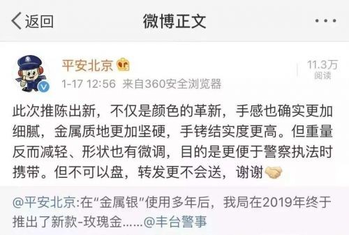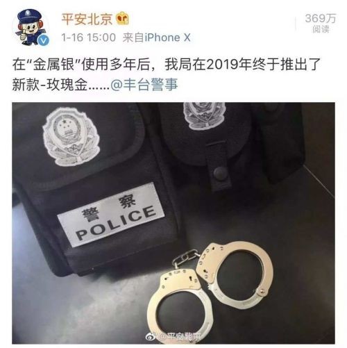 16日,北京市公安局官方微博@平安北京 发消息称:在“金属银”使用多年后,我局终于在2019年推出了新款-玫瑰金手铐: