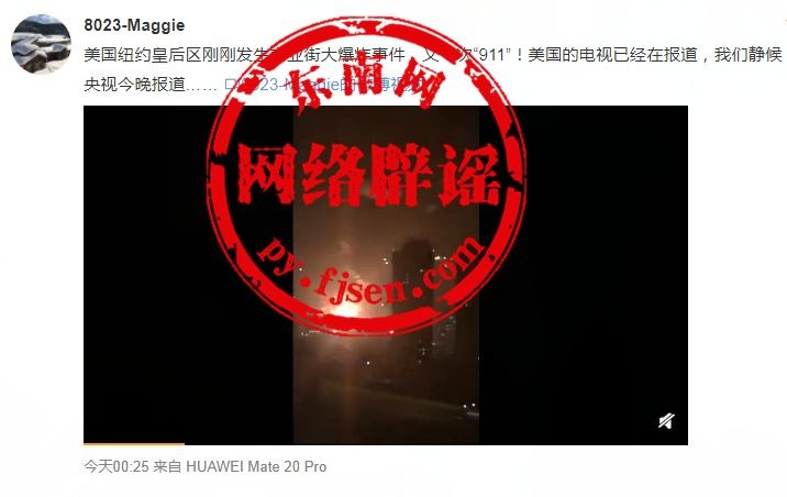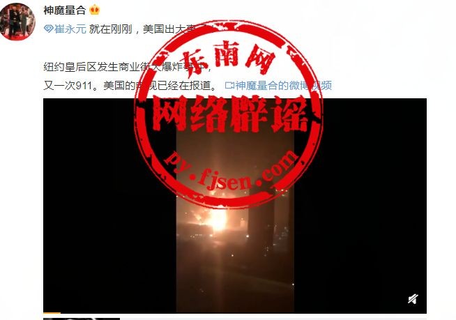 近日,一则“美国纽约皇后区发生商业街大爆炸事件,又一次911”的消息在网上热传。有网友还声称:美国的电视已经在报道,我们静候央视今晚报道。这是真的吗?