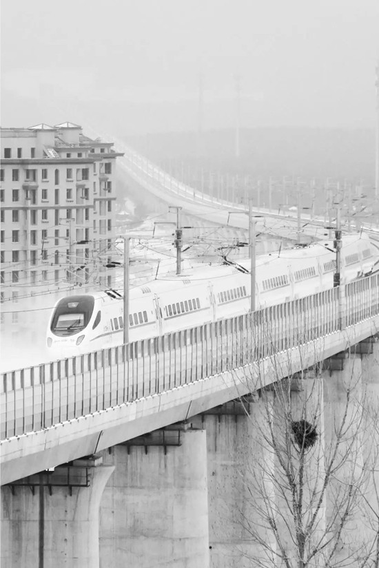 快速疾驰的列车犹如一条银龙匍匐在山顶之上。