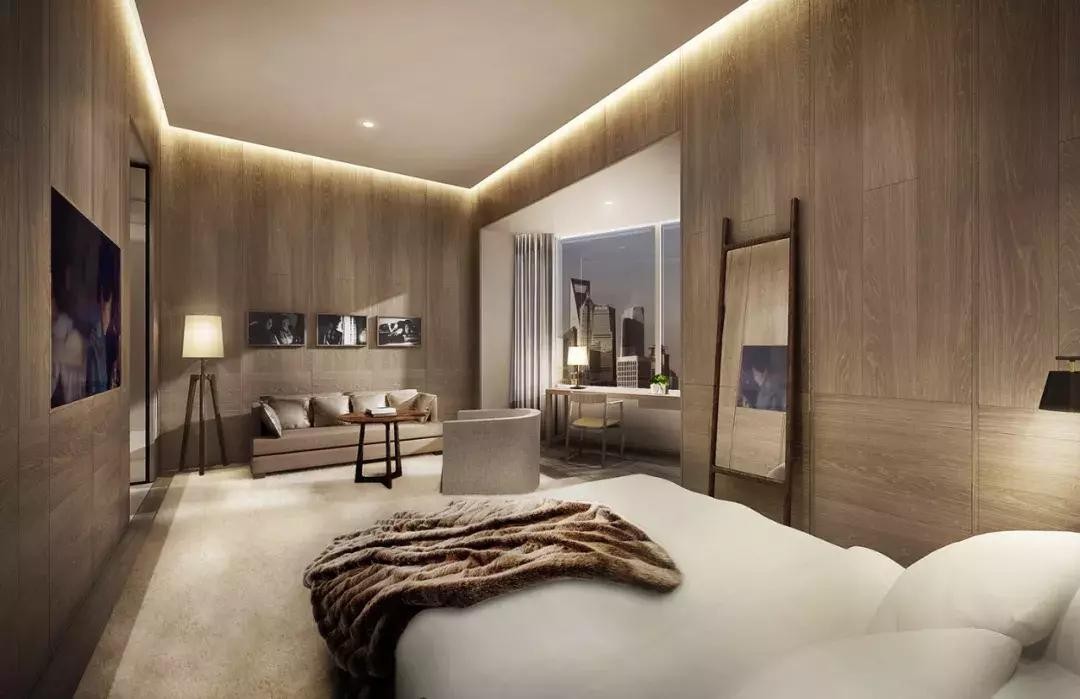 宽敞的房间以优雅的炭色、肉豆蔻色和海军蓝为特色,还有一些很酷的装饰,比如定制的陶瓷床头板,上面纵横交错着中国书法,皮革边的La Boite蓝牙音箱。很大的浴室由玻璃墙隔开,卫生间隐藏在一扇滑动木门后面。客房还配有Lululemon伽垫,迷你哑铃。
