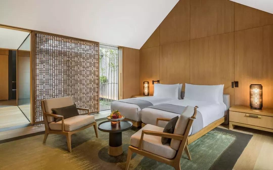 养云安缦有24间四合院套房,每一间套房两侧各有两个庭院;其中一个配有温泉和户外淋浴。房间宽敞明亮,有浅色的木格屏风,宽敞的浴室里有巨大的淋浴室、浴缸,都是柔和的色彩和标志性的极简主义安曼美学。有三间、四间甚至五间卧室。