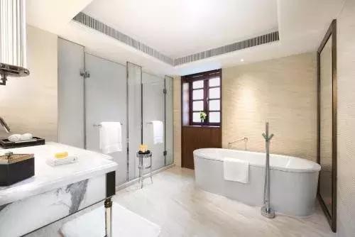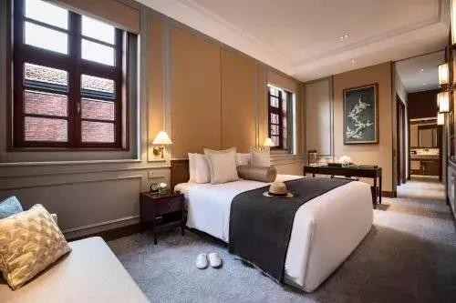 石库门别墅区是上海经典弄堂建筑的缩影,通过一个中央楼梯连接在多个楼层。设计师Jaya Ibrahim的设计理念是对上世纪30年代法式中式优雅风格的最新更新,有4.5米高的天花板、传统的红木框架窗户和几何形状的内部庭院。免费的迷你吧配有一台拉瓦扎咖啡机,以及当地流行的饮料。BOSE音响和Acqua di Parma卫浴产品在巨大的大理石浴室中增强了纵情享受的感觉。爬上阶梯状的上层楼梯,到达一个小平台,可以看到周围屋顶上的瓦片。