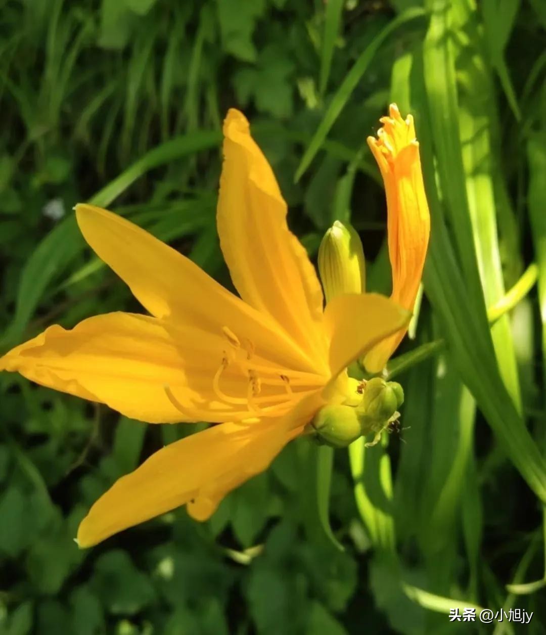 大花萱草和北黄花菜,都是百合科萱草属,形态很相近。黄花菜,在很多植物图鉴上被叫做柠檬萱草,因为它的花色是柠檬黄色的。