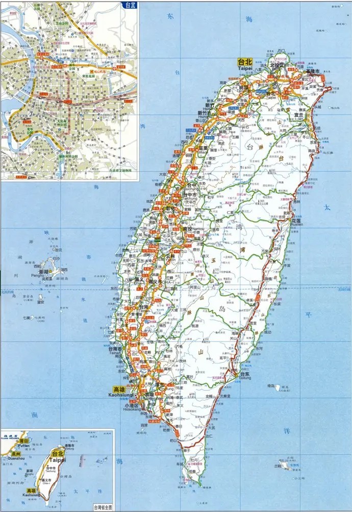 岛内交通以公路为主,由环岛公路、横贯公路和南北高速公路为干线构成公路网,总长约2万千米。其中由基隆至高雄的高速公路,经西部14个县市,长达373.4千米,是岛内交通大动脉。铁路主要为西部纵贯线和宜兰、北回、台东、南回和屏东等线构成的环岛干线,全长约913千米,其中由基隆至高雄的纵贯铁路、长408.5千米,已实现电气化,为铁路主干线。另有支线和生产专业铁路约2000千米。有民用和军用机场约50个,桃园和高雄为国际航空港。有大小海港10余个,高雄、基隆、台中、花莲和苏澳为5大港口。主要有通往日、美及东南亚各地的定期海、空航线,对香港的海、空联系均甚频繁。1995年海运总吞吐量达1.41亿吨,其中90%为进出口货物。左营港为本岛专用军港,高雄、基隆、苏澳等港部分作军用。