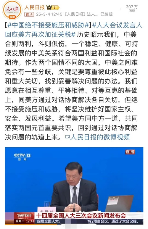 最近,“人大会议发言人回应美方再次加征关税”的消息,瞬间成了大家关注的焦点。这背后,藏着中美关系的复杂纠葛,也凸显出美方一些令人费解的“操作”。