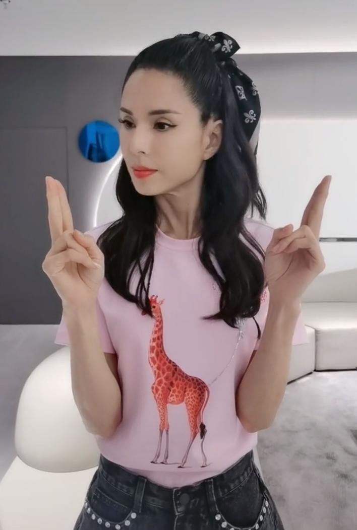 已经54岁的李若彤穿着粉色小鹿图案T恤搭配热裤,显得非常青春有活力。