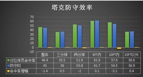 从图中我们看到,在防守端方面,塔克拥有着相对不错的防守效率。对位球员在面对塔克的防守时,整体投篮命中率下降1.4%。而在两分球和小于10英尺的区域内,对位球员的投篮命中率也在降低,这足以看出塔克拥有着不错的内线防守能力,这也源于塔克优秀的臂展。但是在15英尺内和三分球的区域里,对位球员的投篮命中率并没有下滑,对位球员在面对塔克的外线防守时。投篮命中率上升了0.5%。因为年纪大了,脚步移动在减慢。
