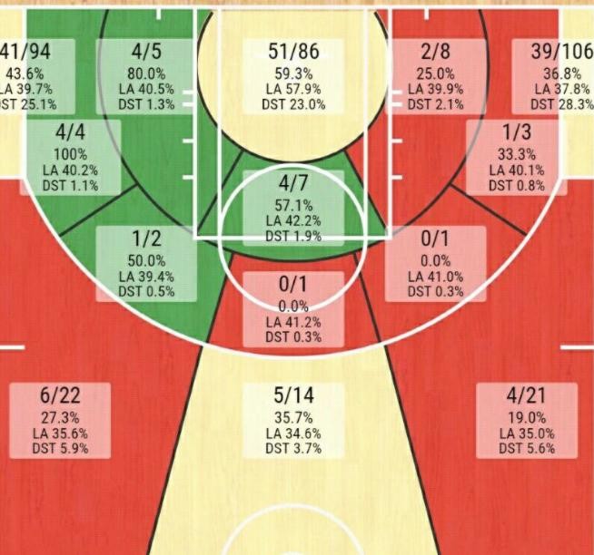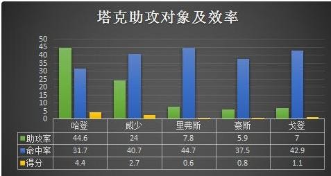 塔克上场35.6分钟场均得到7.9分,从图中可以看到塔克在中距离的投篮出手较少。左翼的进攻和右翼的进攻形成了明显的反差,所以塔克更加适合在左侧区域增加出手次数。距离拉至三分线外,三分线外的进攻效率从左侧到右侧,塔克三分线外的投篮命中率有明显的梯度增幅。可以看到,塔克的三分球主要于球场的两侧底角出手,大部分的三分投篮点都居于底角,且都有着良好的三分命中率,在比赛中,塔克多次在底角投中至关重要的三分力挽狂澜,他是火箭队魔球战术的执行者之一,也是德安东尼的战术点。