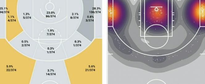 从图中我们可以看出,塔克的进攻选择区域主要分布于底角两侧和禁区内。塔克的外线底角三分出手次数很多,光是底角三分就占据了出手次数的50%以上,他接球就投的概率达到69.8%,投篮命中率为38.7%,可以极大地为球队拉开空间,这是塔克在进攻端的最大战略意义。当然塔克不仅有外线精准的三分,也有在禁区里的得分能力,主要是二次进攻,也很高效。