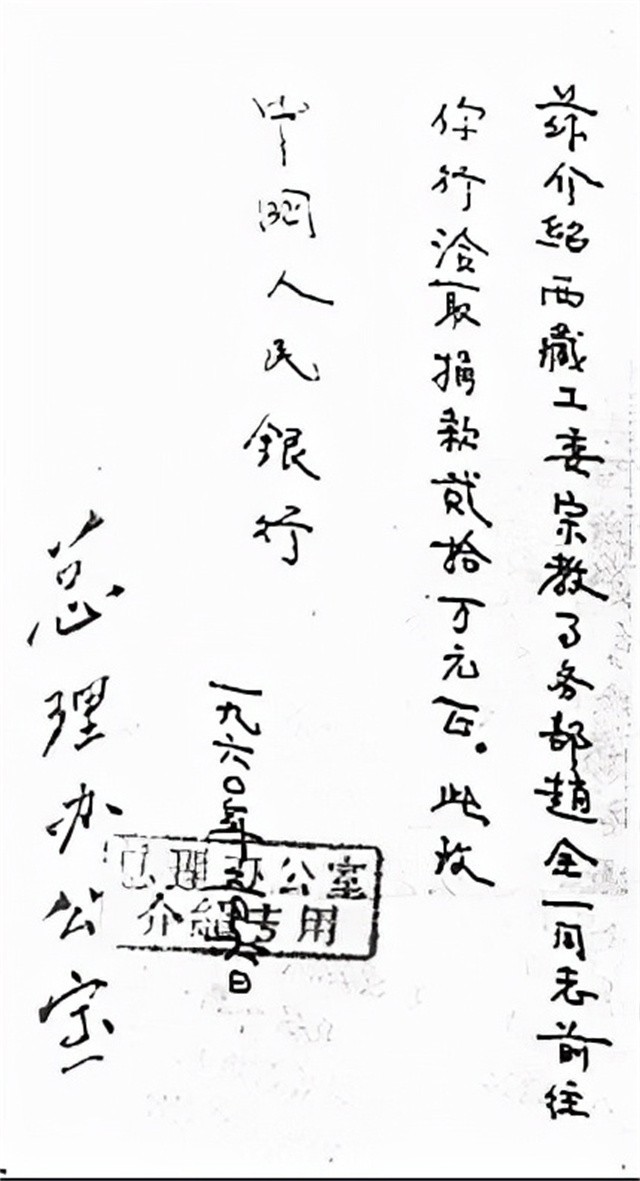 兹介绍西藏工委宗教事务部赵全一同志前去你行领取拨款20万元整,此致中国人民银行。