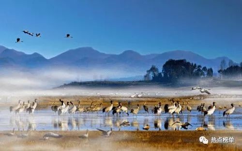 上榜理由:贵州威宁草海国家级自然保护区,位于贵州省西部威宁县县城西南面,保护区面积120平方公里,其中水域面积46.5平方公里。是一个完整、典型的高原湿地生态系统、是黑颈鹤等228种鸟类的重要越冬地和迁徙中转站;是中国著名三大高原湖泊(草海、滇池,青海湖)之一、贵州最大的高原天然淡水湖泊、中国Ⅰ级重要湿地、国家4A级旅游景区;是世界十大观鸟基地,被美国国家地理杂志评选为世界上最受欢迎的旅游胜地,被誉为“贵州旅游皇冠上的一块蓝宝石”;有“高原明珠”、“鸟类王国”等美誉。