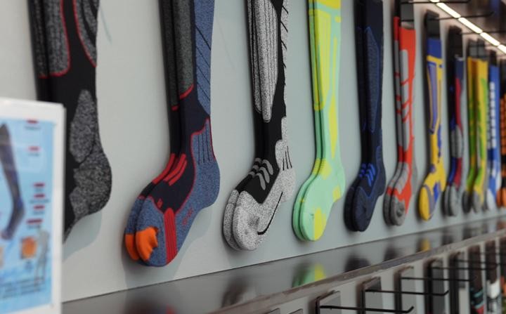 辽源北方袜业集团展示区的墙面上,排列着各类冰雪袜样品。新华社记者 司晓帅 摄