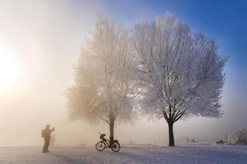 2018年1月11日,游客在吉林市丰满区松花江畔观赏雾凇景观。新华社记者 许畅 摄
