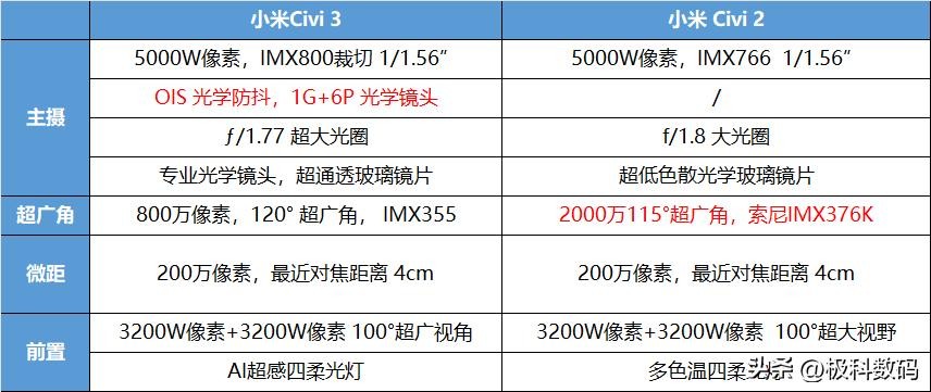 在影像方面,小米Civi 3 的主摄搭载了OIS光学防抖,素质更强,而小米Civi 2在超广角方面则更有优势。两者在影像方面,各有优势与弱势。