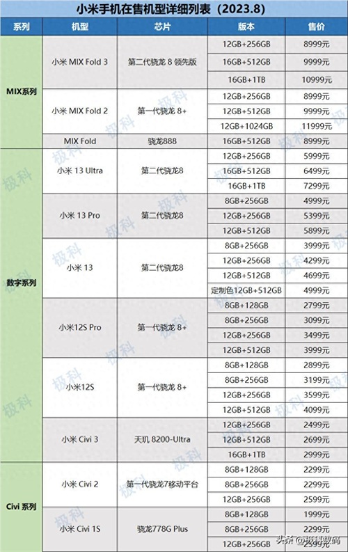 下面列出小米手机在售机型梳理表,以系列划分,重点呈现芯片与各版本的价格对比。(以下价格为某个时间点价格,非实时价格)