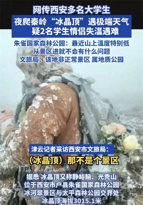 最近,一则让人心痛的新闻在社交媒体上引起了广泛关注:一对年轻的情侣在秦岭冰晶顶的一次深夜登山中,因为突如其来的降雨和低温,不幸遇难。这个消息让许多人感到震惊和惋惜,同时也再次敲响了户外探险安全的警钟。