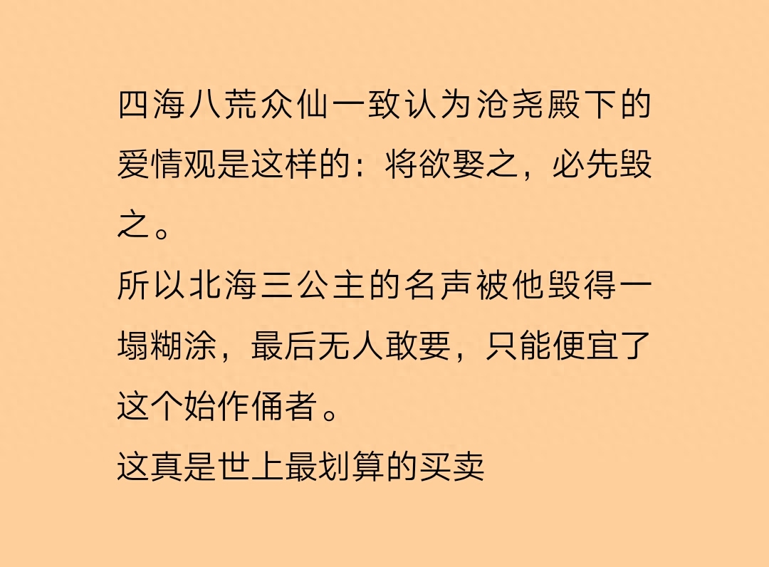 简评:为什么总会有人片面地就界定了一个人的命运?就因为重紫天生煞气,所以她以后必定会入魔?所以谁都可以打着正义的旗子来伤害她?真是讽刺啊,没想到最后阻止转世魔神的居然是她,天生煞气的她。在故事的结尾,重华尊者最终为重紫茹了魔,带她离开了。故事没有交代他们离开后的生活,但是我想,他们一定会过的非常好的。还有一对同样虐心的师徒,阴水仙和她的师傅,番外里有提到,他们最终得以相守。