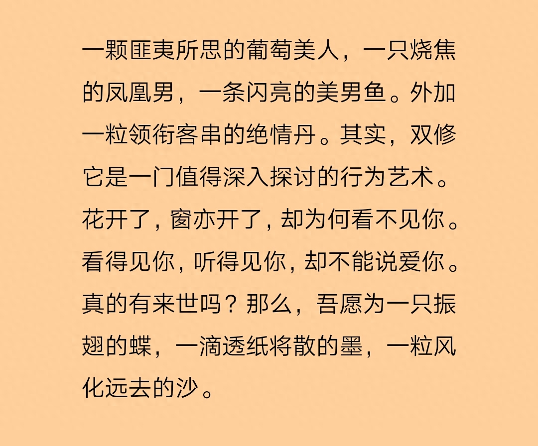 简评:锦觅因为吃了绝情丹,所以断情绝爱,直到旭凤死在她面前,她难过的把绝情丹吐了出来。从这里开始,接下来就比较虐了。旭凤去了魔界成为魔界尊上,锦觅化为兔子守着旭凤,旭凤其实直到但是也没有点破。后来锦觅死了,化为眼泪藏在旭凤的眼睛里,在佛的帮助下显示转世为人后来得以与旭凤相守……当然啦,这一篇的结局是非常好的,旭凤与锦觅最后在一起了,还有了一个小娃娃,番外超级甜。