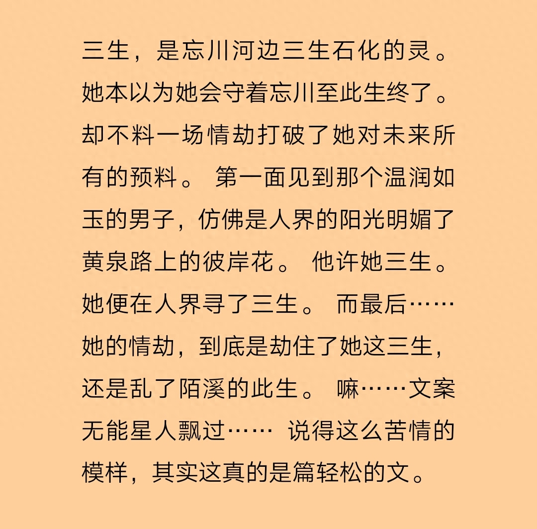 简评:三生是忘川边上一颗化了灵的石头,一场情劫让她寻了战神陌溪三世。在这三世里,他们有情,但是始终无缘。第一世三生被国师当成妖烧死了;第二世她被他当做妖,以为她要害他的弟子,一剑误杀了她;第三世她为救他,被炸死了。这篇只是小虐,文风相对来说比较轻松。这一篇文的结局也是比较不错的,最后陌溪娶了三生,并给了她一颗心。