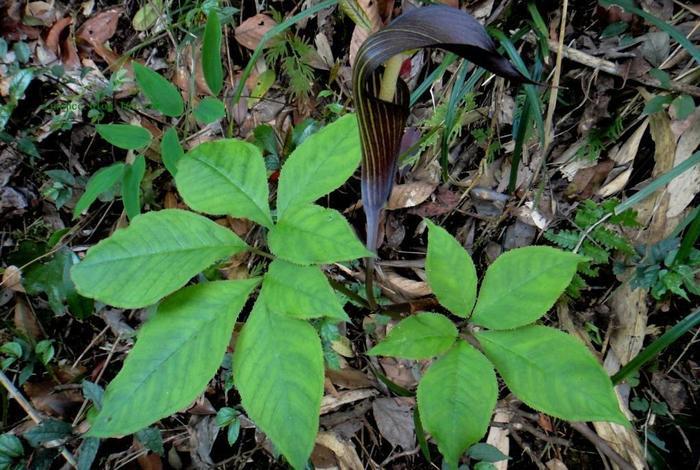 不开花的时候看着还有点像七叶一枝花,是天南星科天南星属,多年生的草本植物,它的别名有好多,又叫它天南星,虎掌南星,野魔芋,打蛇棒,蛇芋头等等。