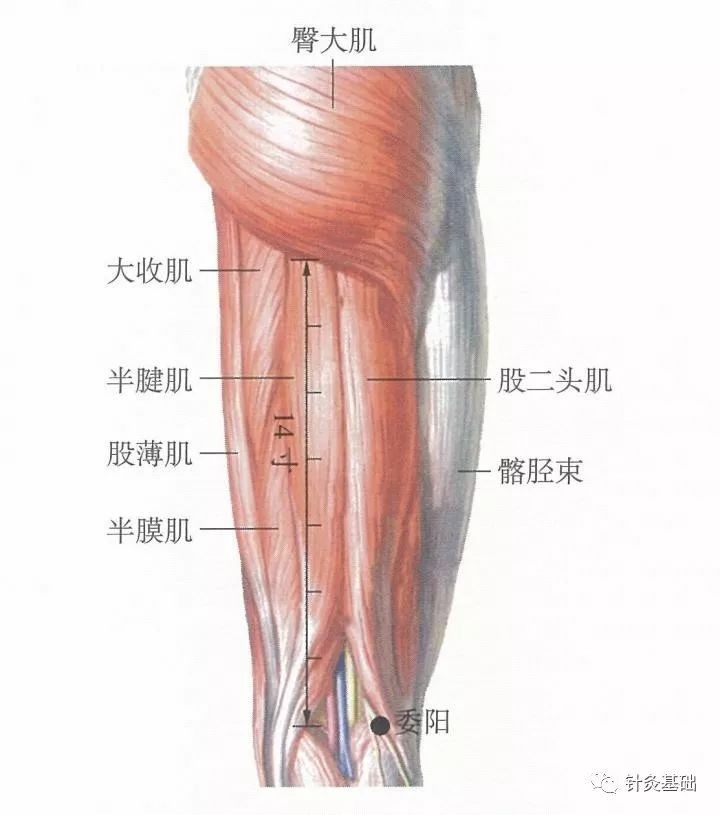 【取法】当腘窝横纹中央,于股二头肌腱与半腱肌腱的中间,俯卧屈膝取穴。