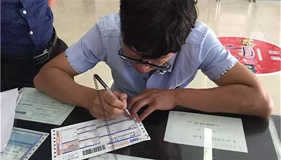 图为9月10日,廖海军填写快递单,将追责控告书寄给唐山市纪委。图片来源:看法新闻