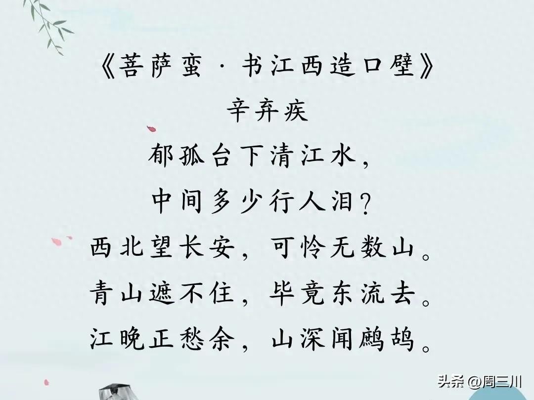 辛弃疾一生以恢复华夏为己任,“袖里珍奇光五色,他年要补西北”是他一生矢志不渝的理想。在他的词中,多处运用“长安“意象,表达了他的强烈的长安情结,那就是对中原山河和人民的系念,对恢复统一的向往,对投降苟安主义者的极度鄙视和愤慨。比如这首著名的《菩萨蛮·书江西造口壁》:郁孤台下清江水,中间多少行人泪?西北望长安,可怜无数山!