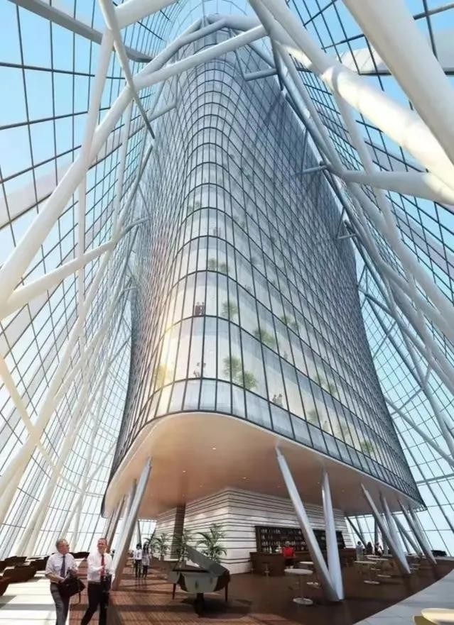 - 结构复杂:外部是连续的外筒结构体系,由柱、周边圈梁和斜撑组合而成;内部结构由核心筒以及周围钢柱支撑组成,楼层越高,向外倾斜的楼板钢柱跨度越大,高层区域由转换桁架支撑。