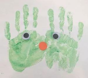 把孩子的两只小手手涂成绿色,并排放在纸上,然后向下按。