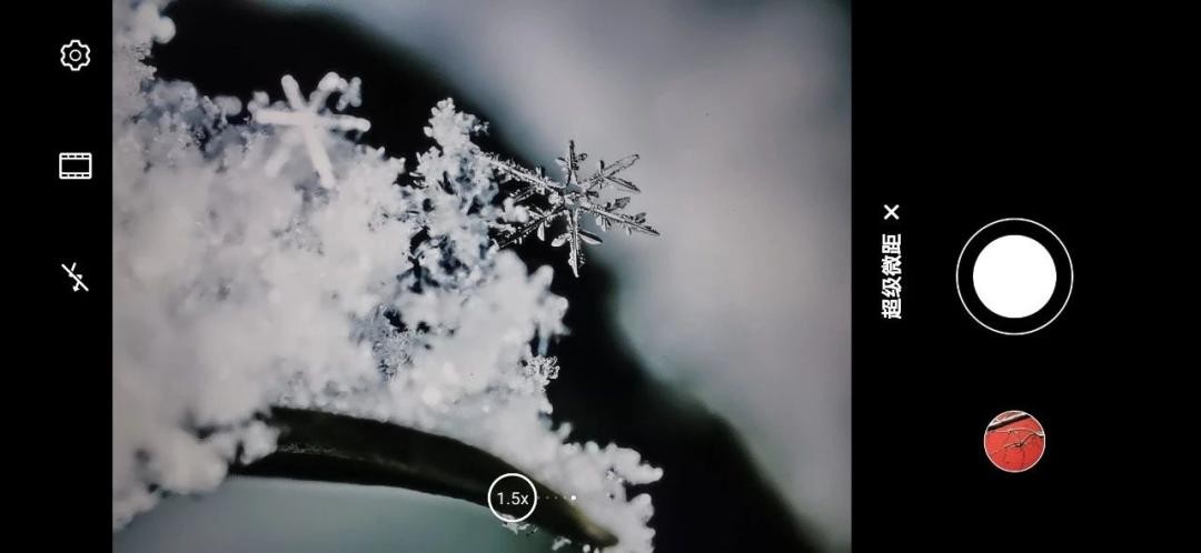 手机微距模式甚至能拍出树叶上雪花冰晶的效果!
