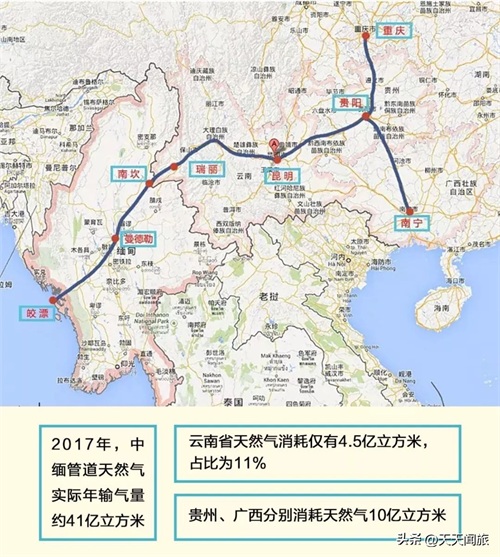 中缅油气管道的石油线起点就位于皎漂经济特区的马德岛。2013年7月,中缅天然气管道正式投运,延伸到广西贵港。2017年6月7日,中缅原油管道全线一次投产成功,标志着我国西南、西北、东北、海上四大能源进口通道基本建成,预计每年对华输送天然气气120亿立方米,输送石油2200万吨,从缅甸的皎漂港输往中国的云南、贵州、重庆等地,结束滇、黔、桂地区没有管道天然气的历史。