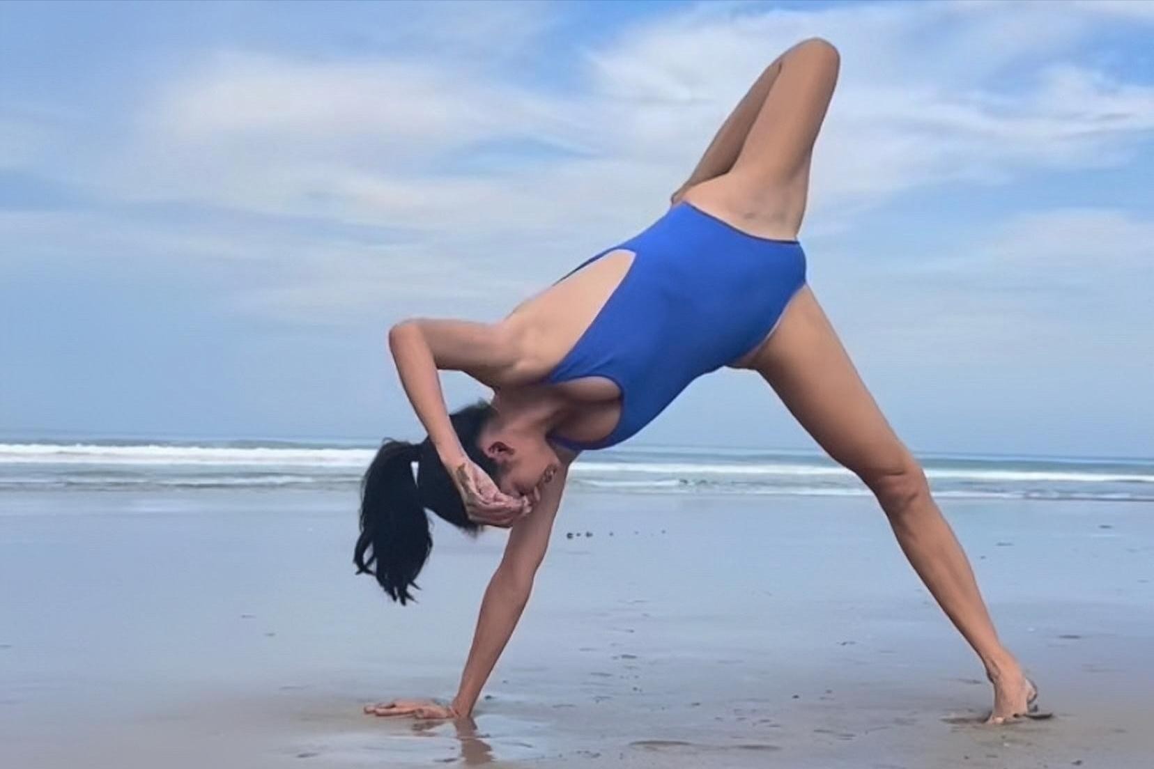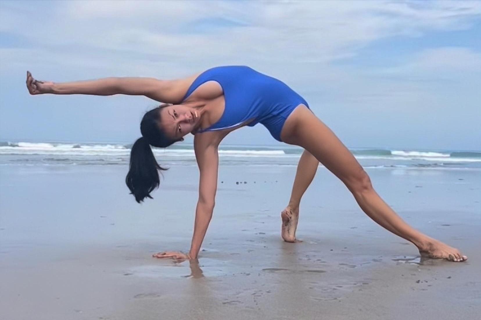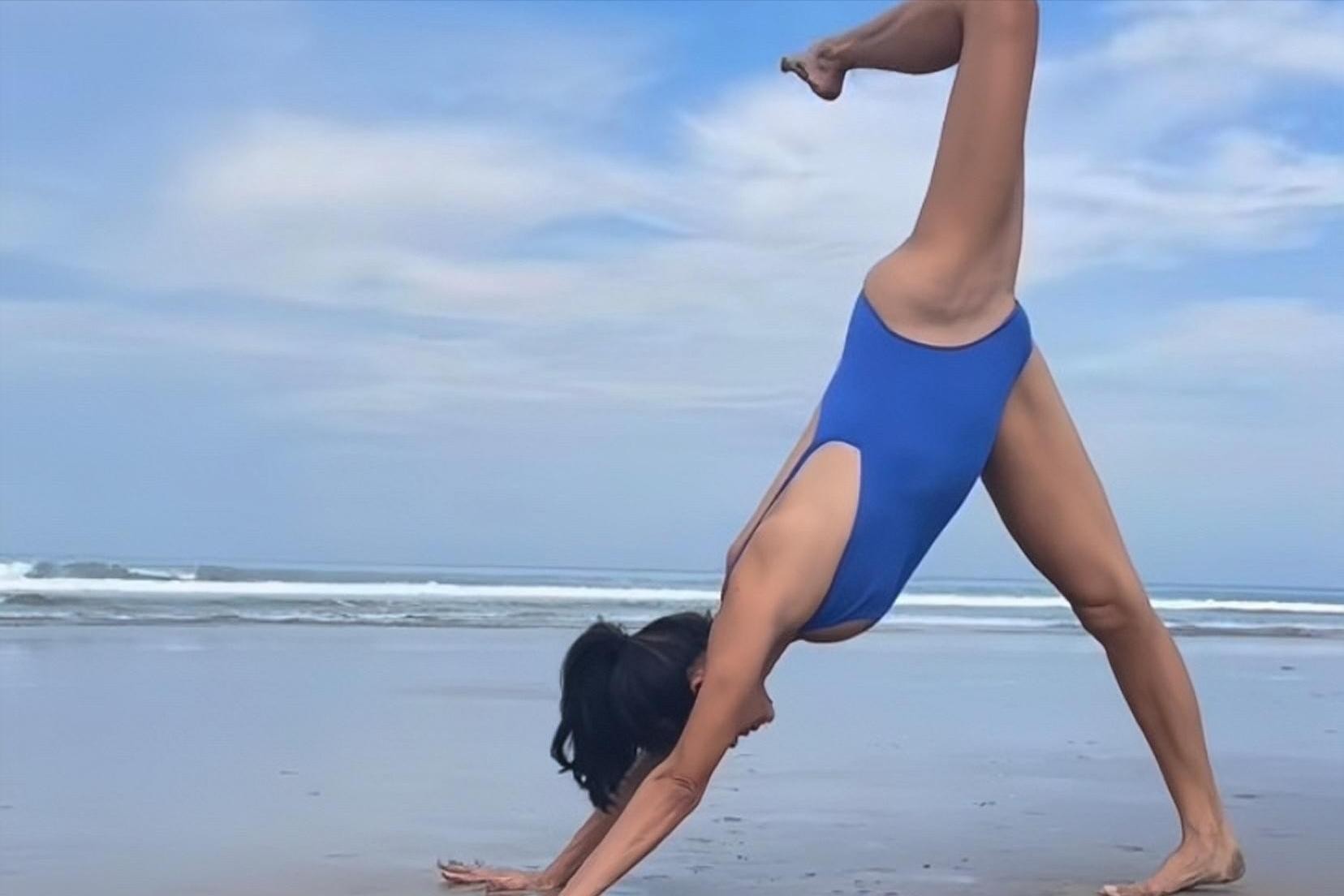 从照片中可以看到,41岁的她,顶着烈日,在蔚蓝的海边,做着高难度的瑜伽动作。