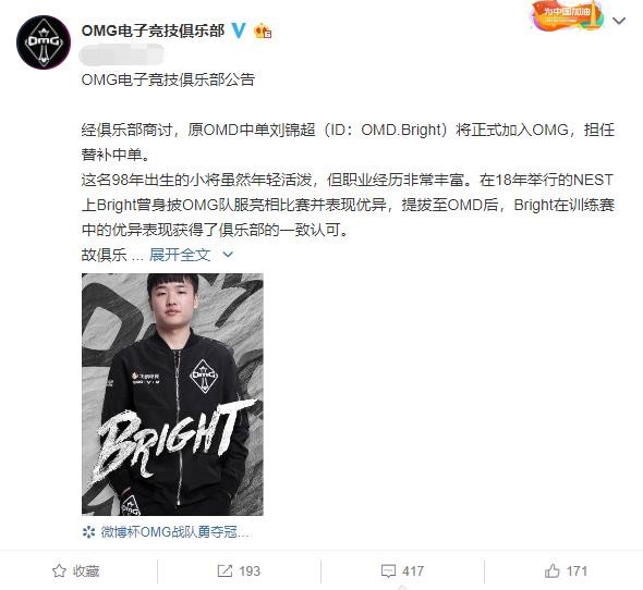 这个新人Bright,是前两天刚加入OMG的新人中单!