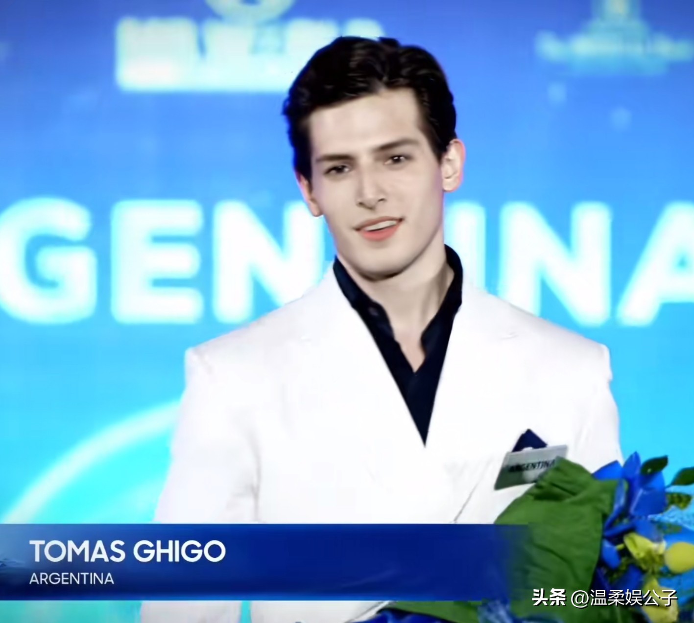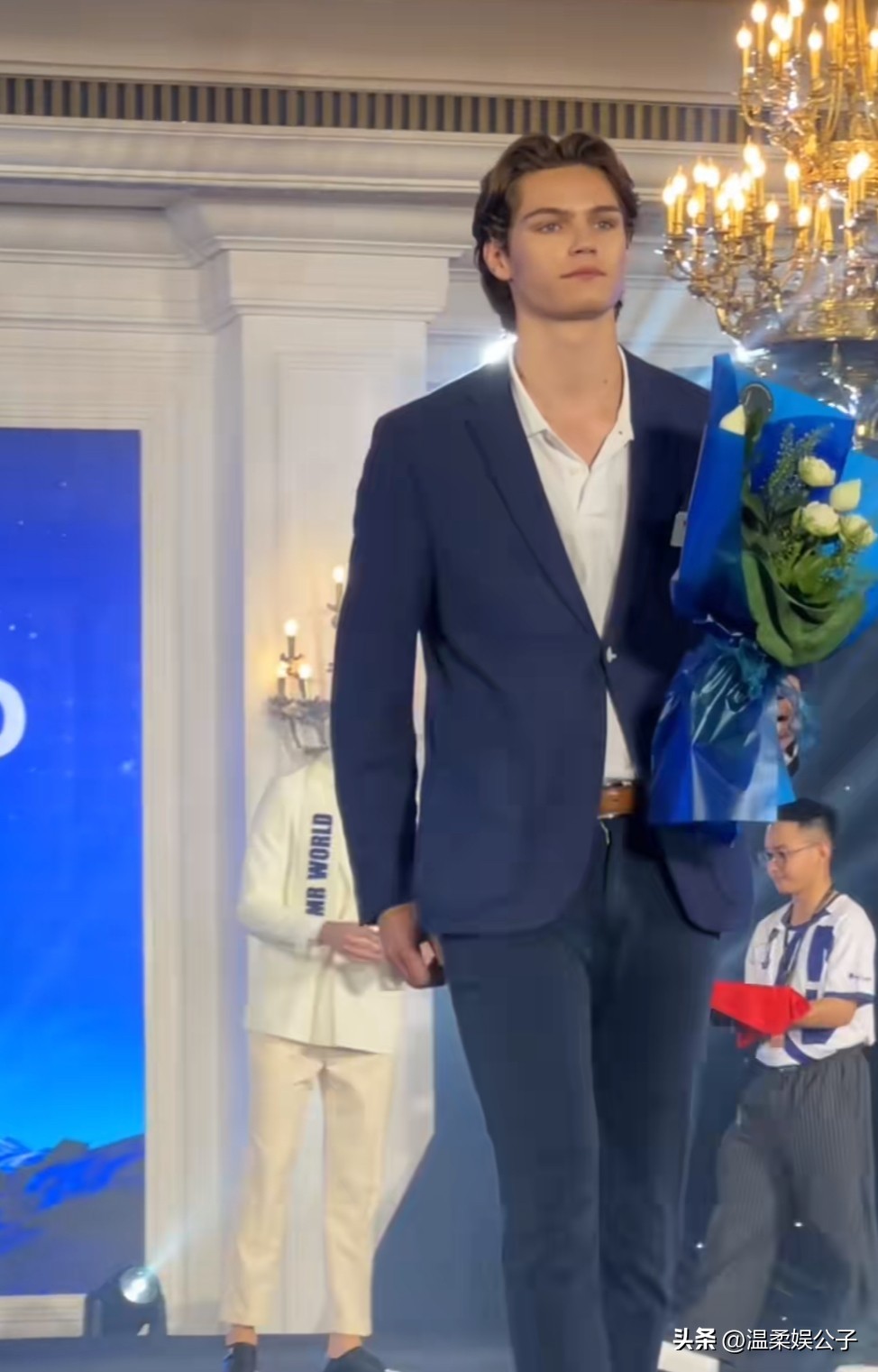 而当托马斯吉戈脱下那身宝蓝色的服装之后,换上一身白色西装的他显得更加迷人,洁白的西装剪裁得体,他怀抱着组委会送来的花束,花朵与他俊朗的面容相互映衬,站在台上笑意盈盈,好一位美男子,一笑就笑到观众心坎上,温暖而明亮。