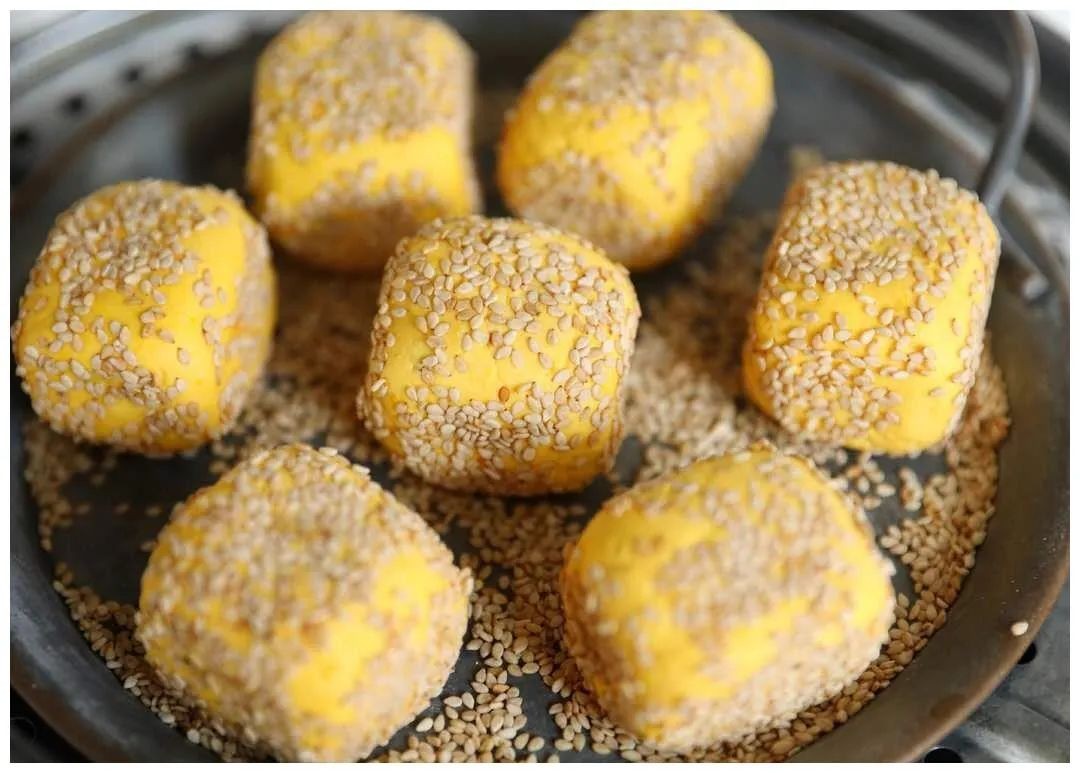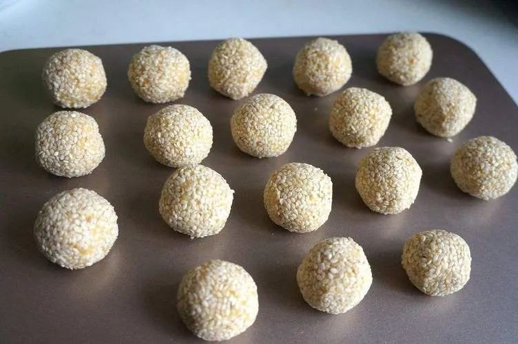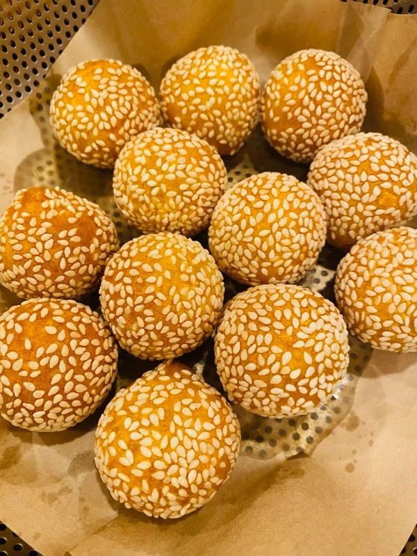 南瓜提前蒸熟,捣成泥状。加入一个鸡蛋和20克白砂糖,搅拌均匀。放入100克面粉和200克糯米粉,搅拌成絮状。揉成面团。搓成长条,切成小剂子。搓成小球。粘上白芝麻。锅中热油预热,放入小球,炸至飘起来。捞出后沥干油备用。