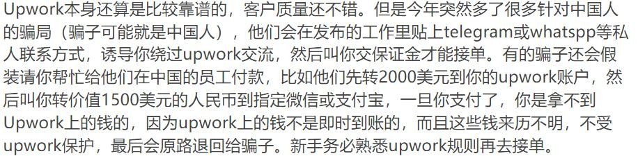 另外,这段时间有在upwork上接单的同学反映,平台上有骗子,务必熟悉规则、保持警惕:
