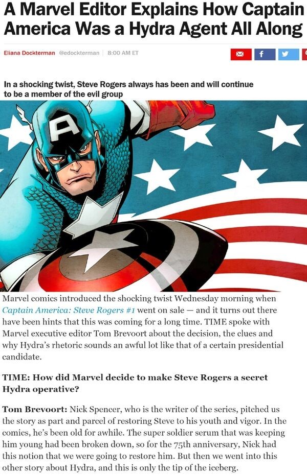 近日,漫威(高级副总裁)Tom Brevoort 证实:美国队长真实身份,是为九头蛇效力的卧底特工。