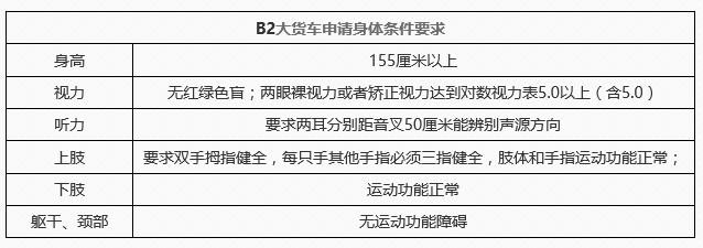 B2驾驶证考取的身高要求为155CM以上。因为大车的驾驶室相对比较高,如果身高太矮可能会影响视线。