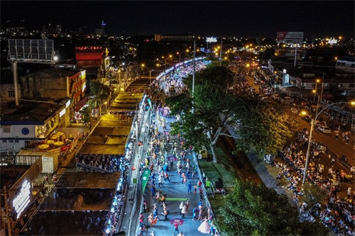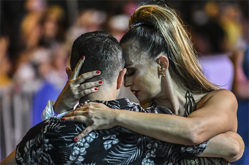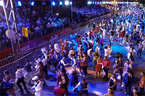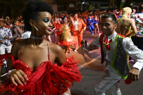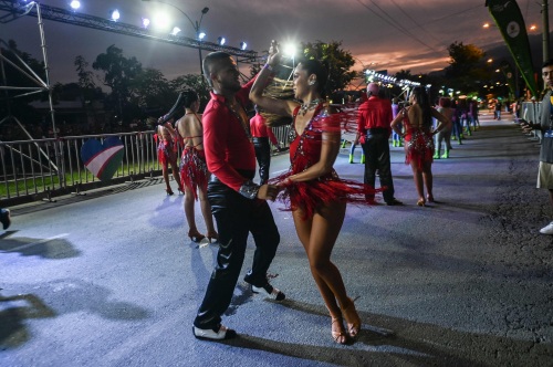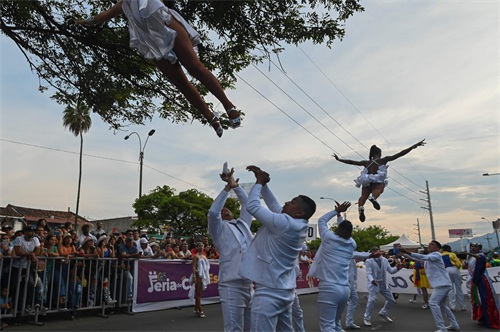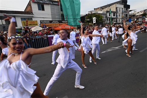 哥伦比亚卡利集会当日开幕,来自当地多所莎莎舞学校的舞者身着盛装走上街头,参与游行表演。