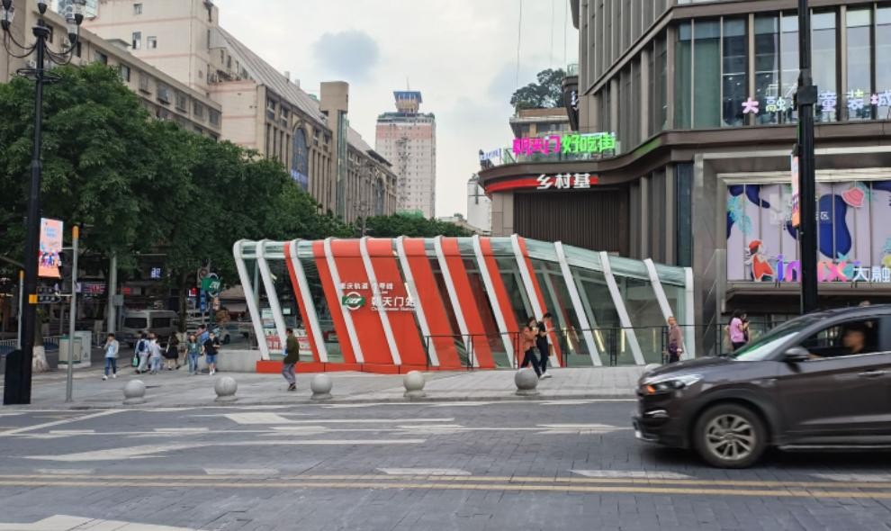 从地铁1号线朝天门站出来就来到了来福士的门口,这个出站口设计得非常别致,颇有点时光隧道的感觉。